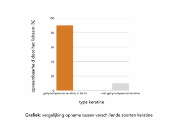Het gepatenteerde ontwikkelingsproces maakt de keratine eveneens wateroplosbaar (gehydrolyseerde keratine). Hierdoor is de keratine zeer goed opneembaar door het lichaam, dringt ze gemakkelijker door tot in haren, huid en nagels, en voedt ze de haarwortel van binnenuit. Zie Grafiek